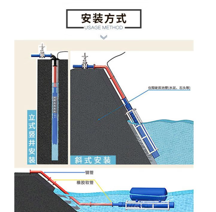 1立式竖直使用,比如在一般的水井中;